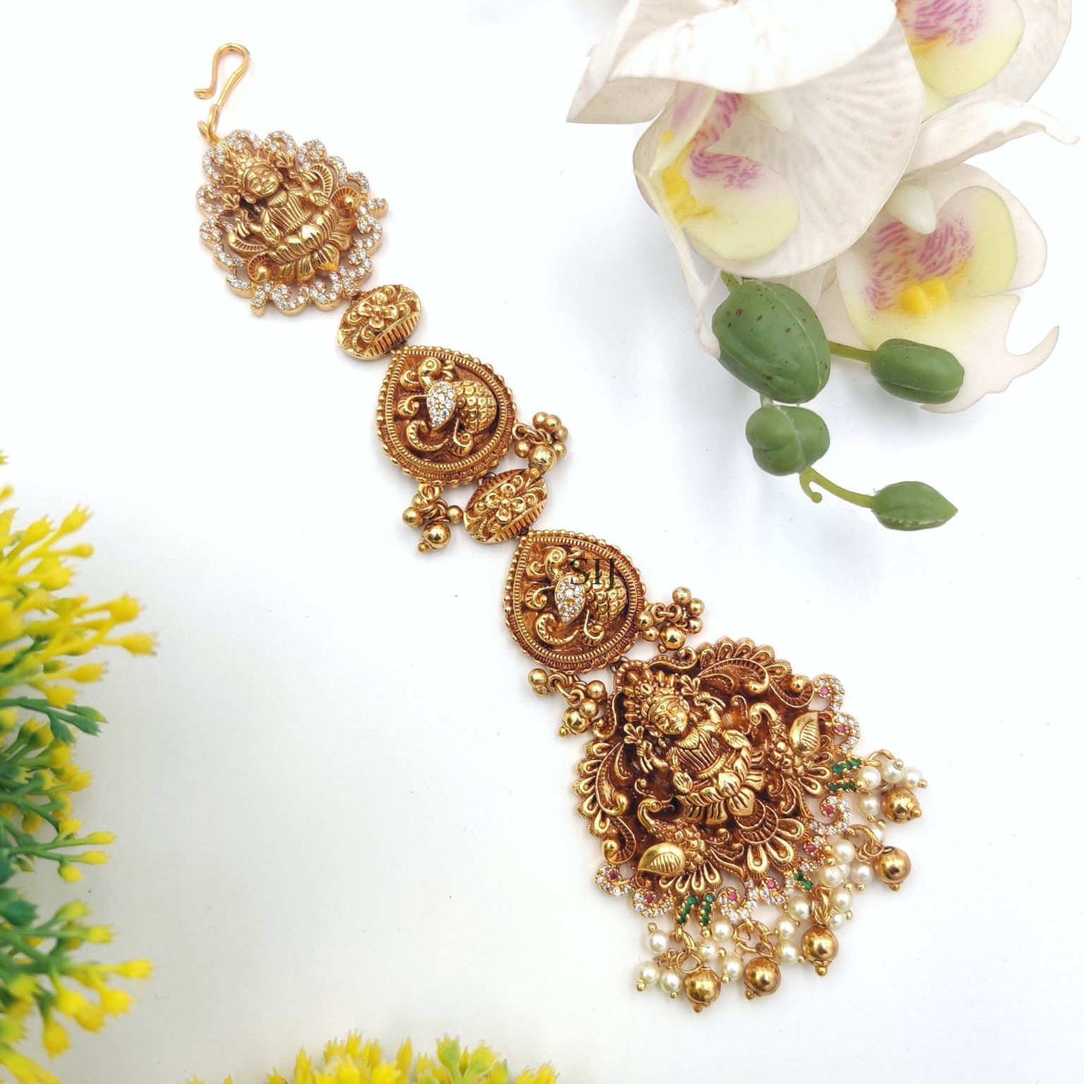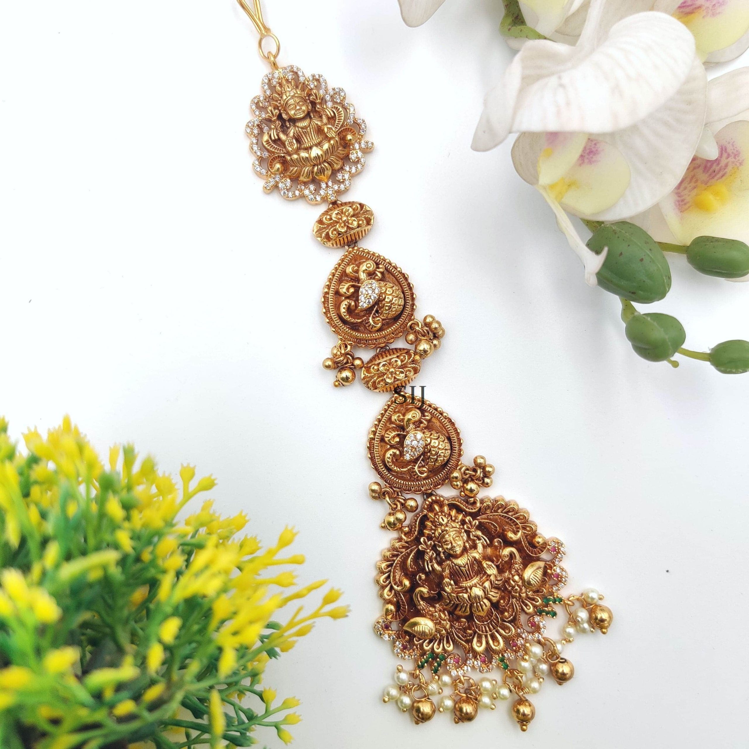The Nakshi Lakshmi Gold Plated Maang Tikka is an elegant traditional Indian accessory that exudes sophistication and divine beauty.